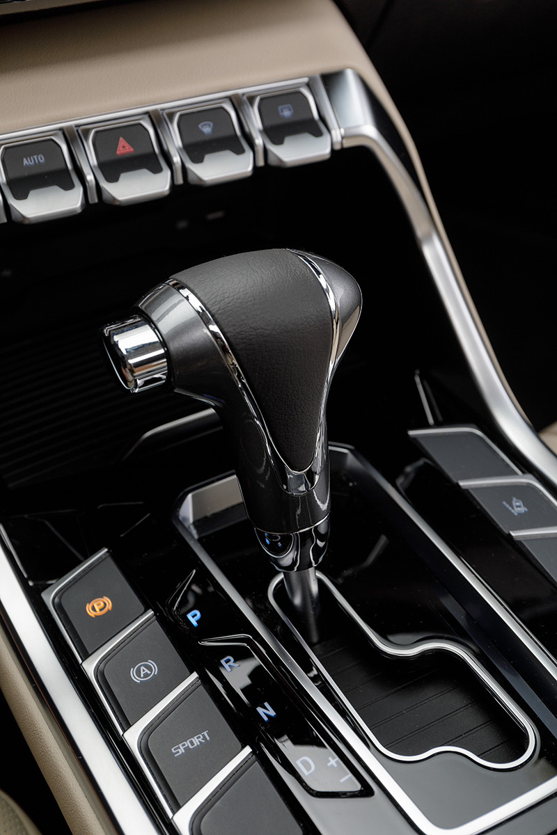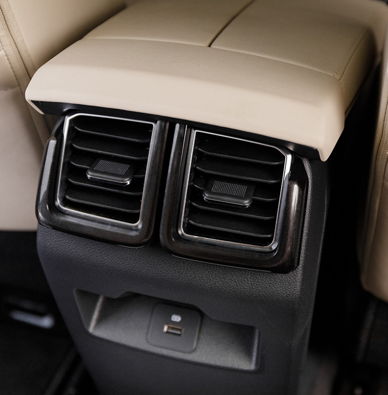 O interior, com console central elevado e teto solar panorâmico elétrico de série, tem bom nível de acabamento e conforto. A versão SEL tem tom escuro, na cor Black Charcoal, e bancos com revestimento premium. O banco traseiro, além de um descansa-braço rebatível com porta-copo, conta com saídas do ar-condicionado automático digital e entrada USB.