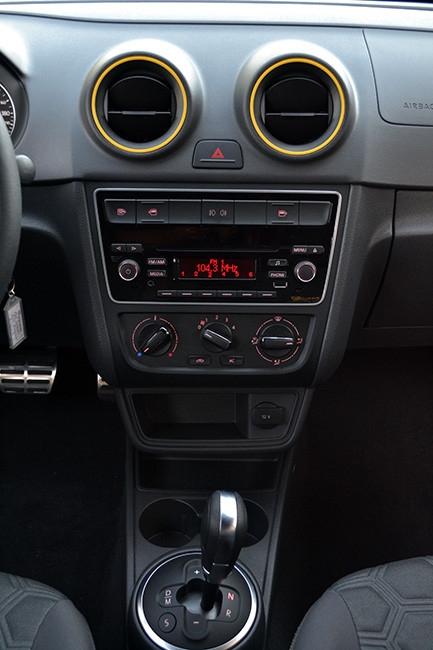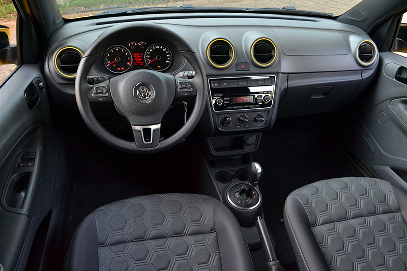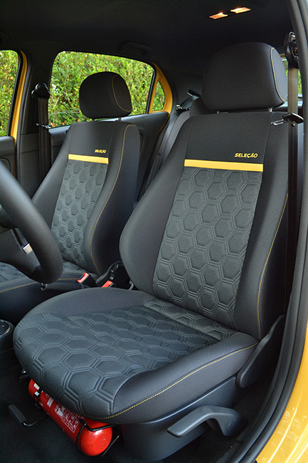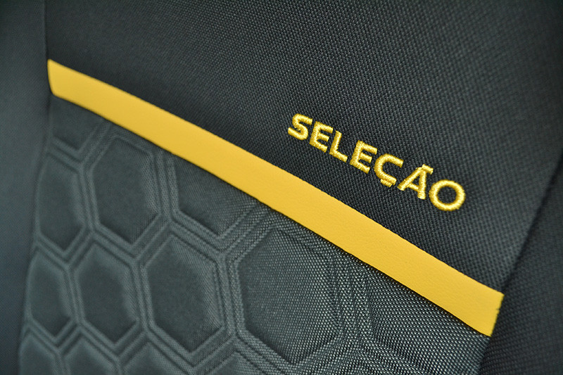 Outro item que chama a atenção são os bancos com revestimento em tecido, que trazem um grafismo em baixo relevo tipo “Soccer”. Mais uma vez, o desenho é do “gomo” hexagonal da bola de futebol. Pra fechar o pacote, os pedais trazem cobertura de alumínio e o porta-objetos, que traz o escudo da CBF.