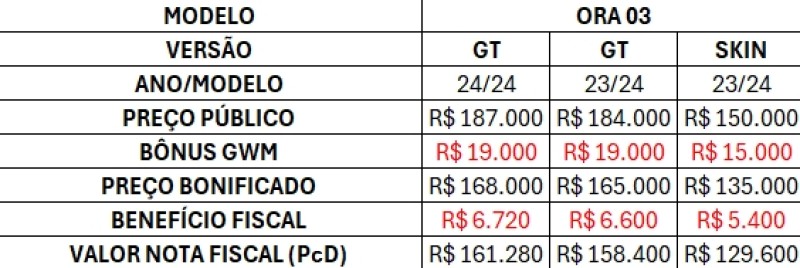 Já na versão GT na linha 2023/2024, o preço de tabela cai de R$ 184.000 para R$ 158.400, devido ao bônus GWM de R$ 19.000 mais R$ 6.600 de benefício fiscal. O ORA 03 GT linha 2024/2024 reduz seu preço de R$ 187.000 para R$ 161.280 na opção PCD, com bônus GWM de R$ 19.000 e R$ 6.720 de benefício fiscal. A única versão que não está habilitada para o programa é a série especial ORA 03 GT Approve.