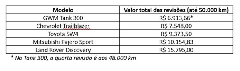 Total de revisões do GWM Tank 300: R$ 6.913,66