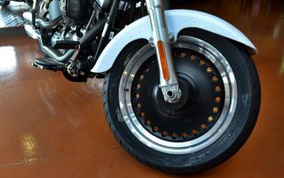 O lendário visual da Fat Boy está mais robusto do que nunca, graças a uma nova roda dianteira de 17 polegadas, maior que a anterior, de 16, e um pneu traseiro mais largo, de 200 mm. A marca registrada do modelo é a roda dianteira em disco de alumínio, que ganhou novos bullet-hole. Novos detalhes gráficos no tanque de combustível e em ambos os para-lamas acrescentaram um toque ainda mais estiloso à moto .