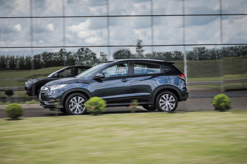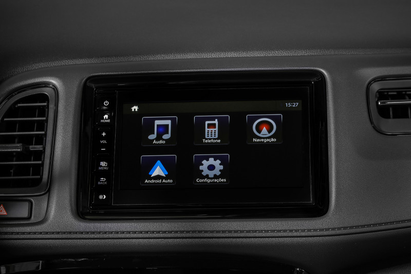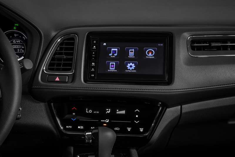 Nas versões EXL e Touring, o HR-V oferece todos os itens acima e bancos revestidos em couro, central multimídia de 7 polegadas com navegador integrado, retrovisor interno fotocrômico e sensores de estacionamento dianteiros e traseiros, além da grade frontal com acabamento em black piano.