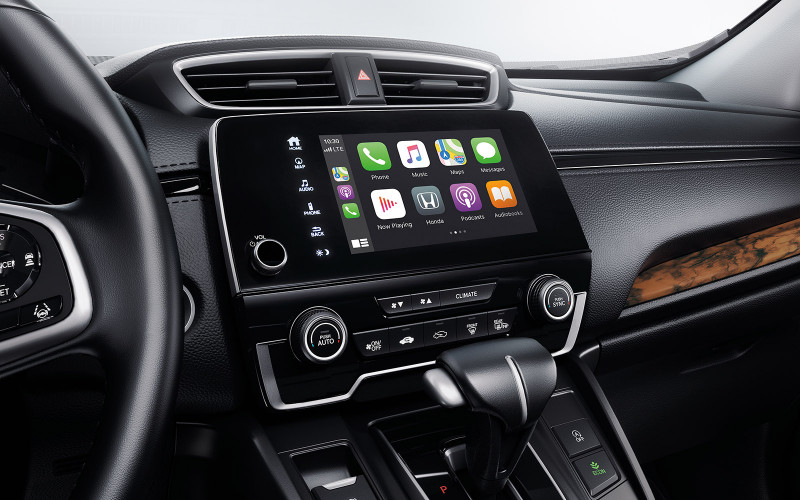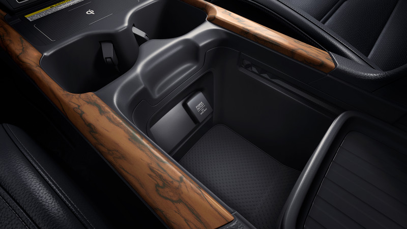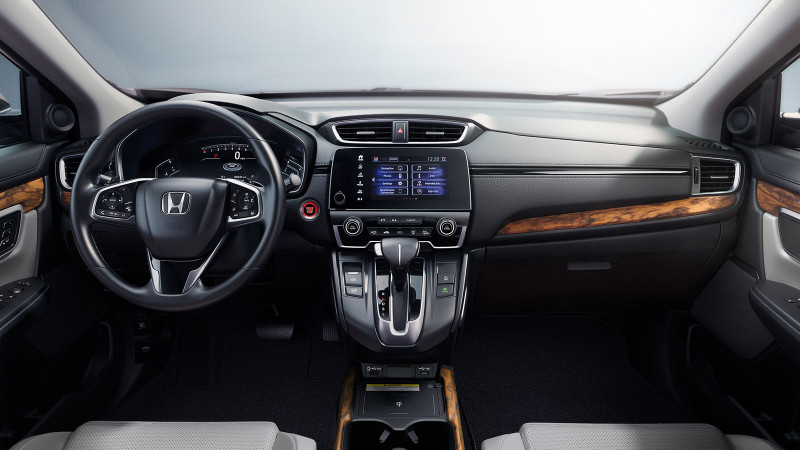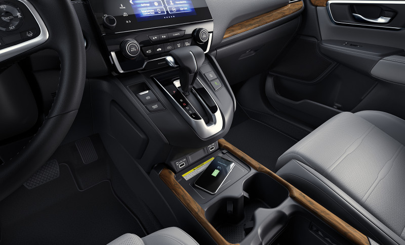 No interior, o CR-V 2021 traz o console central redesenhado, com um novo sistema de bandeja retrátil. Esse console central traz acabamento amadeirado - acompanhando as linhas do painel e das laterais de portas - e abriga ainda um carregador de celular por indução, além de portas USB reposicionadas, permitindo uma melhor organização de dispositivos eletrônicos.