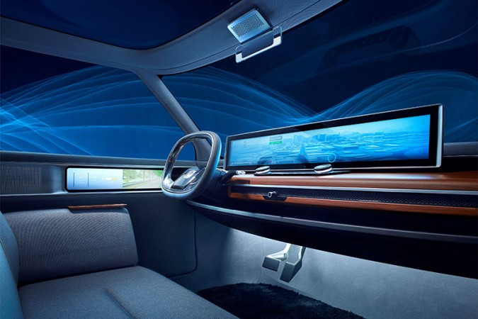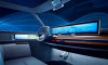 O mesmo acabamento de madeira envolve um grande console de painel flutuante. Este abriga a coluna do volante, um conjunto de botões de controle simples e uma tela de exibição panorâmica. O painel em si é complementado por uma tela envolvente que está posicionada atrás do console e se estende para as portas. A tela principal apresenta uma variedade de informações do veículo, incluindo o nível remanescente da bateria. As telas das portas funcionam como os espelhos do carro através de monitores de câmeras digitais.