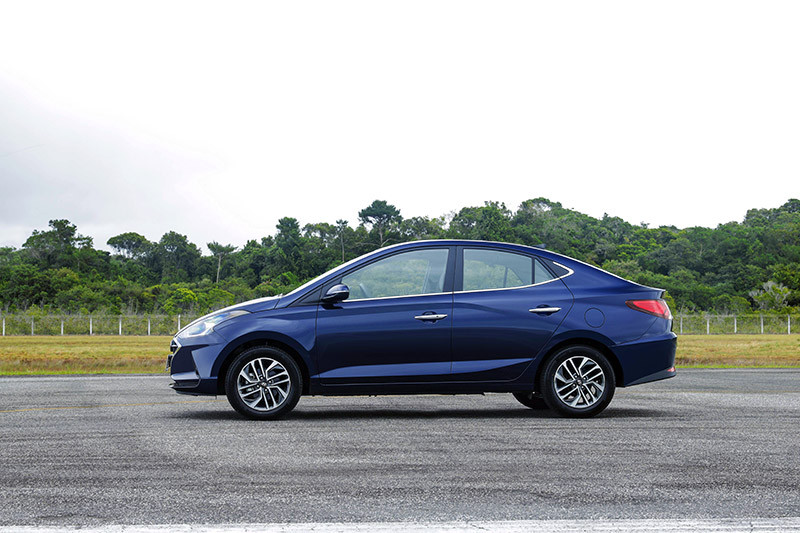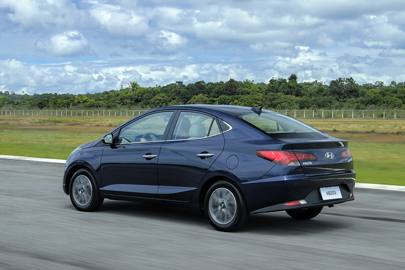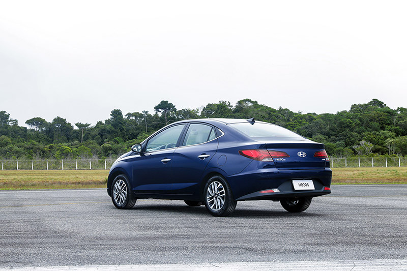 Na configuração sedã, o caimento mais prolongado do teto até o porta-malas proporciona ares de fastback ao três-volumes e remete à identidade visual dos “irmãos maiores” Elantra e Sonata. Assim como nesses sedãs, o HB20S traz lanternas horizontalizadas, boa área envidraçada traseira e placa reposicionada para o para-choque.