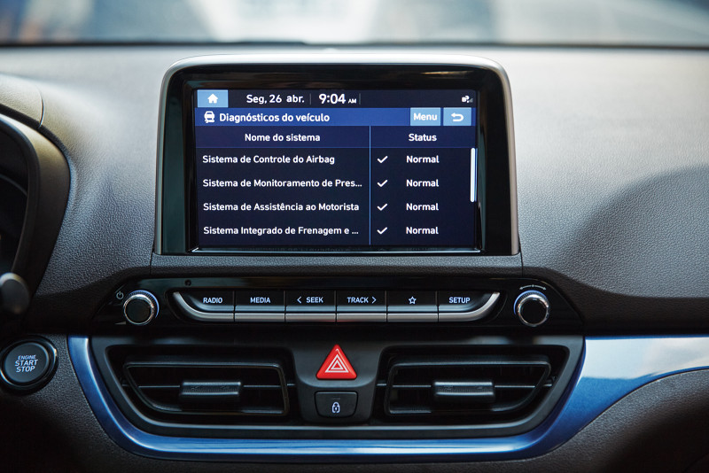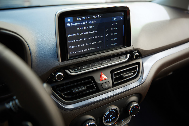 Pela central multimídia também é possível ter acesso a um diagnóstico completo de sistemas do carro, como os airbags, a pressão dos pneus, direção elétrica, entre outros. Da mesma forma, em caso de detecção de falha, será enviado um alerta para o App Bluelink. Nesse serviço é possível consultar relatórios mensais com informações e gráficos comparativos sobre o estilo do motorista ao volante, o que é ideal para aprimorar a experiência de condução, tornando-a mais confortável, conveniente e segura.