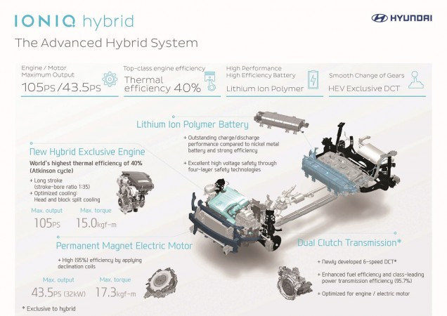 Com maior índice de eficiência térmica do mundo (40%), o novo moto r Kappa 1.6 litro GDi, desenvolvido exclusivamente para os moto res híbridos da Hyundai Motor, será o responsável pelo fornecimento de 105 cavalos de potência e torque de 15 kgfm. Ele será acoplado a uma transmissão de dupla embreagem e combinado com o moto r elétrico magnético, que fornece o equivalente a 47 cavalos, permitindo uma maior aceleração inicial. A bateria é de íon de lítio polímero.