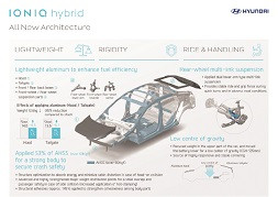 Construído sobre um chassi criado especificamente para abrigar as três opções de moto rização, eficientes e com baixíssimas emissões, o IONIQ utiliza em 53% de sua carroçaria um avançado aço de alta resistência, combinado inteligentemente com a leveza do alumínio. Quando necessária, a estrutura de absorção de energia dispõe de avançados aços de alta resistência que podem suportar forças de colisão significativas. A utilização do alumínio nesta combinação garantiu ao novo modelo uma redução de peso de 12,6 kg, proporcionando uma carroçaria não-estrutural 45% mais leve do que se composta apenas pelo aço.
