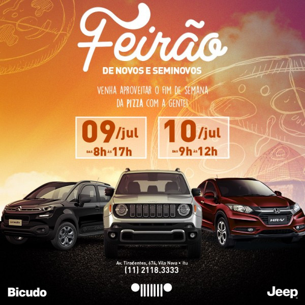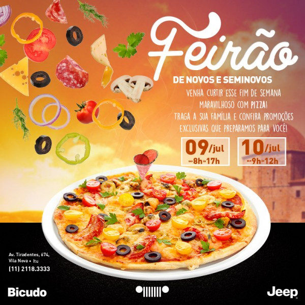 A concessionária Jeep de Itu, do grupo Bicudo, realizará um mega feirão neste final de semana, sábado e domingo, 9 e 10 de julho. E em comemoração ao dia da Pizza que é dia 10 de julho, todos os clientes da concessionária que forem no sábado ou no domingo, ganharão uma mini pizza.