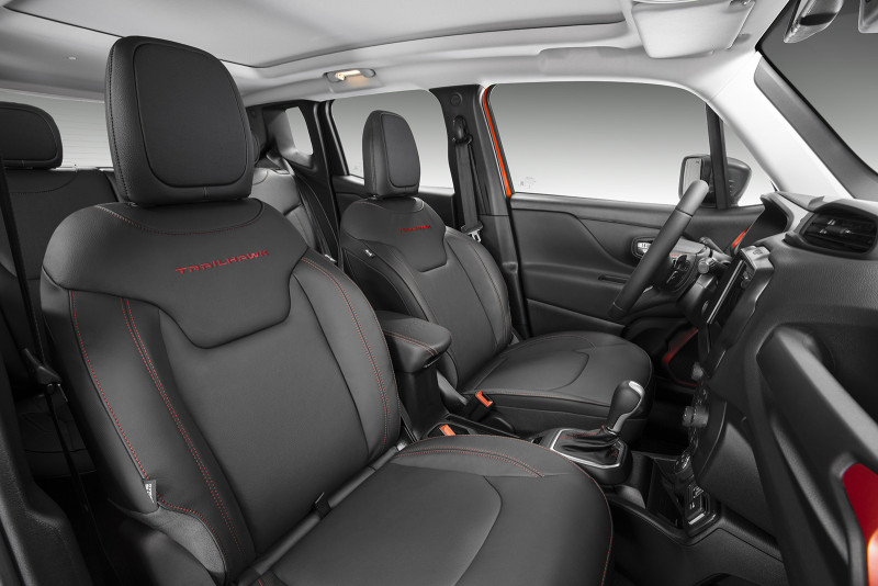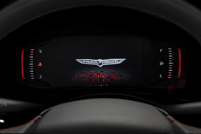 A versão Trailhawk soma os itens da S e possui visual exclusivo, com rodas de 17” de liga-leve, pneus de uso misto exclusivos da versão e suspensão elevada, além de proteções off-road para cardan, câmbio e tanque de combustível, e o selo Trail Rated, que assegura sua aptidão para as trilhas mais exigentes. O quadro de instrumentos digital de 7” tem uma animação exclusiva, enquanto a cabine usa bancos em couro com costura vermelha, mesmo tom dos acabamentos dos alto-falantes e saídas de ar-condicionado laterais. O seletor com cinco modos de condução inclui a exclusiva configuração Rock (pedra), ideal para encarar grandes obstáculos, algo possível graças aos ângulos off-road extremos: são 30º de ataque, 22º de rampa e 32º de ângulo de saída. Ainda é possível adquirir como opcional teto solar elétrico panorâmico.
