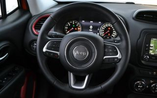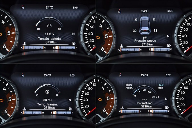 O painel, por exemplo, revestido com material suave ao toque, é intercalado com elementos como a alça de apoio para o passageiro dianteiro, indispensável no uso off-road e inspirado no irmão maior, o Jeep Wrangler. E na versão Trailhawk existem alguns outros elementos que lembram a proposta 4x4. O conta-giros, por exemplo, traz a região de limite de giro pintada em marrom, fazendo alusão ao barro.