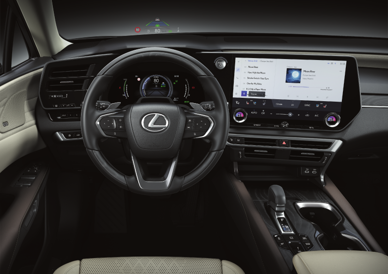 Pautado pelo princípio de Omotenashi da marca, termo em japonês que significa hospitalidade, o novo Lexus RX 450h+ foi desenvolvido de dentro para fora, ou seja, todos os comandos se mantêm em posição ergonômica e em posição intuitiva, enquanto o Head-Up display permite visualizar as principais informações no próprio para-brisas.