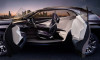 Na frente, os pára-lamas do carro fluem para dentro da cabine para formar as telas do espelho eletrônico que mostram a imagem de câmeras instaladas na porta. A parte superior do painel é mais baixa do que as telas para combinar um visual desconstruído com excelente visibilidade. Para a traseira, a carroceria flui novamente para dentro da cabine, formando a estrutura principal dos apoios de cabeça do banco traseiro.