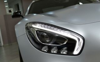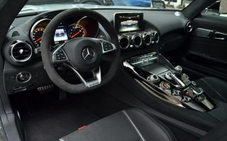 O Mercedes-AMG GT é um superesportivo em sua forma mais pura. A localização do moto r V8 biturbo na parte frontal e a configuração do eixo de transmissão assegura uma excelente distribuição de peso, de 47% na dianteira e 53% na traseira. Faróis full LED de alta potência com "sobrancelhas" estilizadas como luzes de condução diurna, assim como três refletores separados, criam um "olhar" característico para o GT.