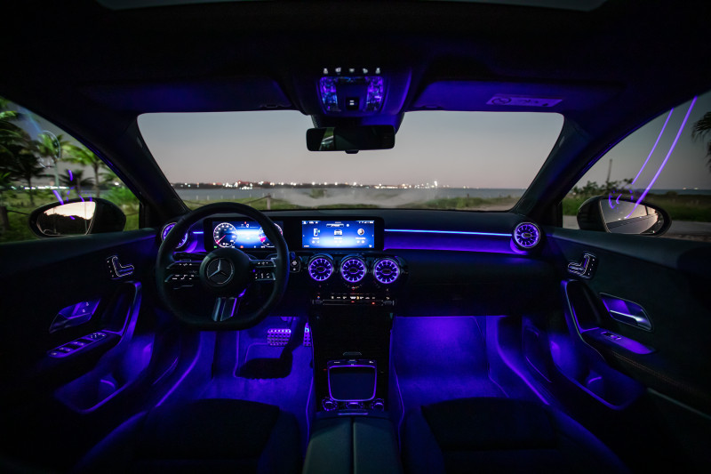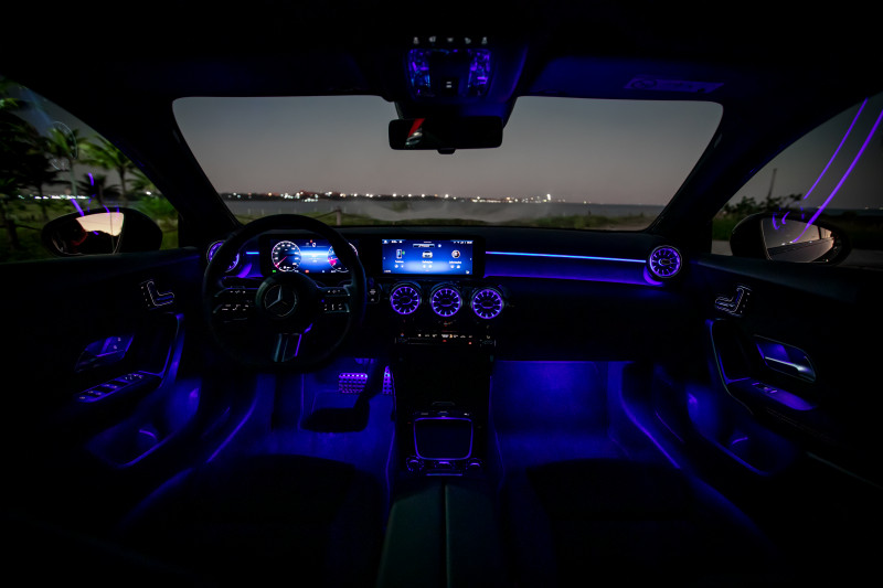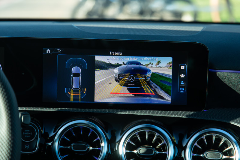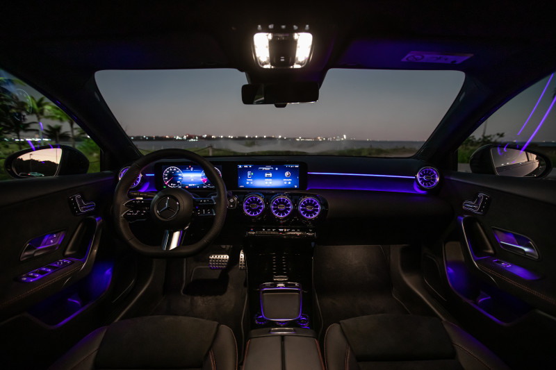 No interior, a exclusividade se reflete com a tela dupla independente de 10,25 polegadas que parecem flutuar com sua aparência ampla. A arquitetura interna, única nesse segmento, dá origem a um ambiente de iluminação especial. As três saídas de ar redondas em forma de turbina, características marcantes da Mercedes-Benz, são inspiradas no segmento da aviação. O volante em couro, é compacto e combina com a tecnologia do console central redesenhado. Além disso, a versão A 200 AMG Line apresenta acabamento em DINAMICA/microfibra no painel e pespontos contrastantes em vermelho nos bancos revestidos em ARTICO/DINAMICA microfibra na cor preta.