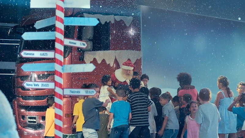 Outra interessante ação da Mercedes-Benz foi trazer o Polo Norte para o Brasil, com duendes e Papai Noel, para realizar o sonho das crianças da ONG AZO, um dos projetos sociais que apoia desde 2013. A ação \"Peça para uma estrela\", em formato de filme (assista aqui), mostra a viagem dessas crianças até a fábrica da marca, onde foram surpreendidas com um cenário mágico e muitos presentes.Para transformar a fábrica da Mercedes-Benz no Polo Norte, o espaço ganhou uma decoração completa com iglu, mesa de doces natalinos, boneco de neve, cortina de marshmallow, neve artificial, entre outros. Os próprios funcionários da marca foram voluntários e se vestiram de duendes para entregar os presentes durante a ação. E para o transporte de cada um deles, foi utilizado um veículo da frota da Mercedes-Benz: o ônibus levou as crianças ao Pólo Norte, o caminhão trouxe o Papai Noel, e a van conduziu os duendes com os presentes.Foram 72 horas de gravação, com mais de 150 pessoas do staff e cerca de 30 crianças participando da ação. Também foram doados aproximadamente 190 brinquedos à instituição AZO. As cenas do filme foram gravadas no centro histórico de Santos e no Espaço Mercedes-Benz, em São Bernardo do Campo, com câmeras, drones e gruas. O filme fica no ar por três meses nos canais proprietários das marcas de Caminhões, Ônibus e Vans da Mercedes-Benz no YouTube e no Facebook.A ONG AZO proporciona a inclusão social e o desenvolvimento humano por meio de atividades culturais e esportivas, a fim de que as mais de 300 crianças e jovens participantes se sintam parte da sociedade, como agentes de sua transformação em um lugar melhor e mais justo para todos.