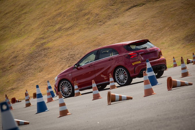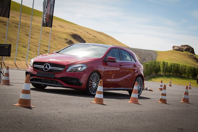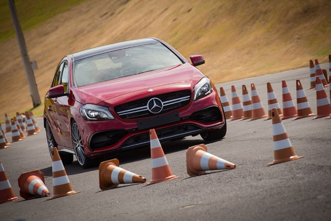 Uma das atividades do AMG Performace Tour é o Pro-Solo com o Mercedes-Benz A 45 AMG, que é equipado com tração integral e moto r 2.0 turbo de 381 cv. Trata-se de uma prova de precisão em baixas velocidades, em um circuito delimitado por cones. Ganha o moto rista que fizer o percurso no menor tempo, sem derrubar os cones.