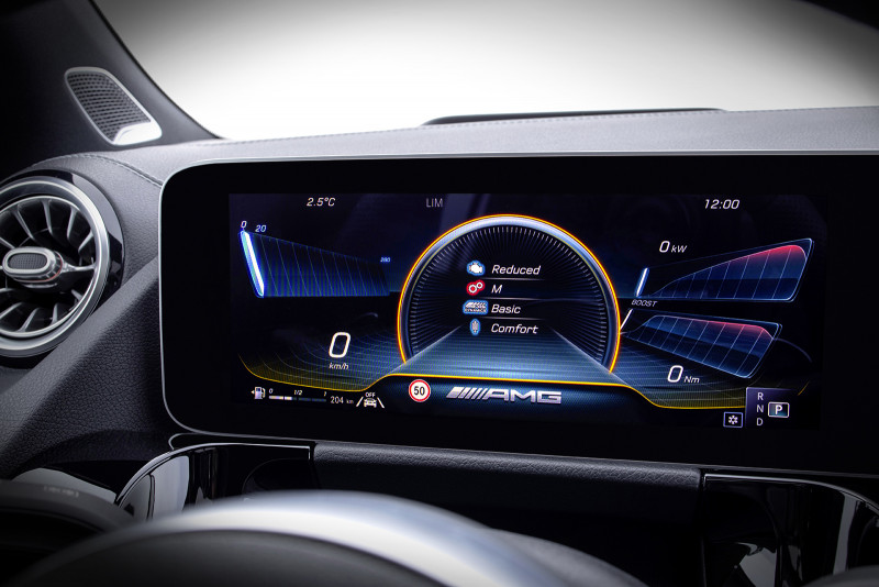 O painel de instrumentos pode ser exibido em três estilos: "Classic", "Sport" e "Supersport". Por meio do menu AMG, o condutor pode acessar vários displays especiais, como “Warm-up”, “Set-up”, “G-Force” e “Engine Data”. O console central com acabamento em visual de fibra de carbono e touchpad possui teclas adicionais que controlam as funções ESP de 3 estágios, modo de transmissão manual e a suspensão AMG RIDE CONTROL com amortecimento ajustável de forma adaptável.