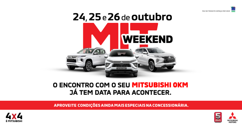 A Mitsubishi Motors realiza a partir de amanhã (24) até sábado (26) mais uma edição da MIT Weekend. A quarta ação comercial do ano trará condições especiais e exclusivas para a compra de um modelo zero quilômetro da marca nas concessionárias de São Paulo (https://www.megamit.com.br/mitsubishi-guarulhos) e Sorocaba (https://www.megamit.com.br/mitsubishi-sorocaba#/), além dos já conhecidos 5 anos de garantia em sua linha de veículos.
