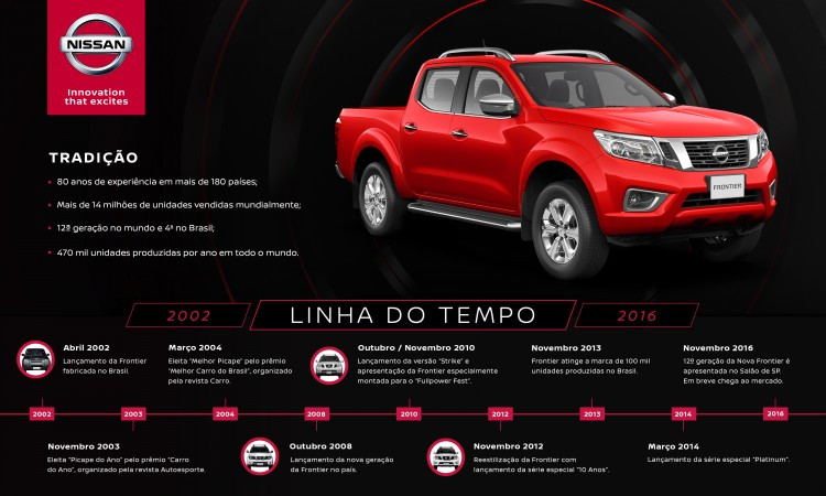As picapes sempre estiveram ligadas aos momentos importantes da Nissan no Brasil. Em 2000, a empresa iniciou suas atividades oficiais, ainda como importadora, no mercado brasileiro e a Frontier foi um dos primeiros modelos vendidos pela marca no país. Dois anos depois, o começo da produção da Frontier na fábrica da Aliança Renault-Nissan, em São José dos Pinhais, representou ainda o início oficial da fabricação de veículos Nissan no Brasil. E, desde então, com força e versatilidade, a Frontier pavimentou sua trilha de sucesso no mercado nacional, com mais de 100.000 unidades vendidas.