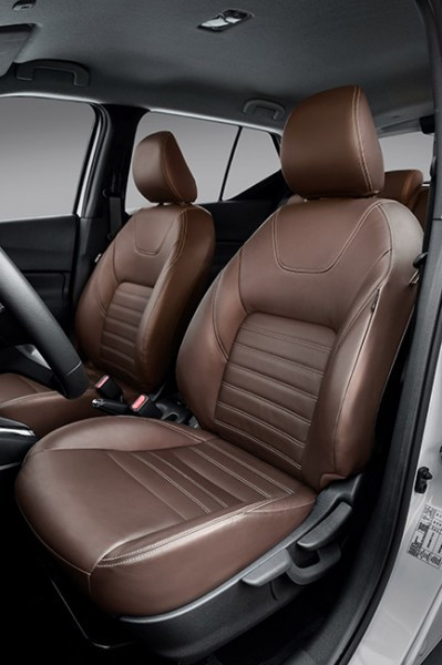 O inteiror do Kicks tem uma boa qualidade de acabamento e isolamento acústico. Além dos bancos, existe acabamento em couro no painel e nas portas. Um dos destaques fica por conta de existirem três opções de cores para o acabamento de couro: Preto, Macchiato (marrom) e Sand (bege).