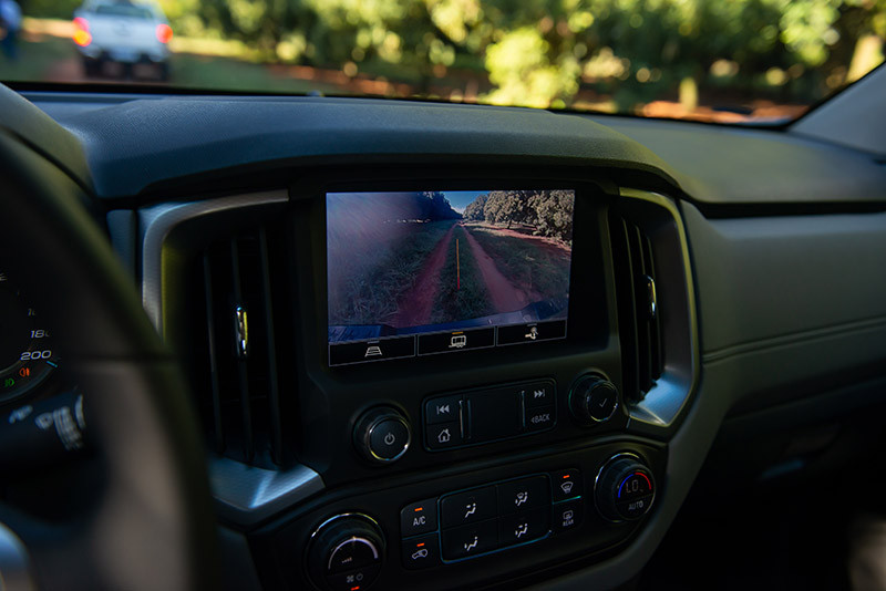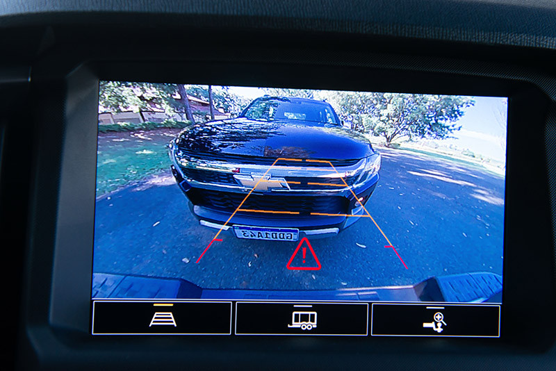 Na parte traseira, a picape equipada com câmera de ré de alta definição e conta com a função de engate. Traz linhas linha-guia específica e zoom para facilitar a operação. Outro recurso interessante deste sistema é que o usuário consegue acionar temporariamente a câmera traseira em plena viagem para uma checagem da situação do reboque. Importante ressaltar que a S10 conta com o controle eletrônico de oscilação do trailer. Este sistema é capaz de identificar alguma instabilidade dinâmica da carreta e frear seletivamente as rodas da picape.