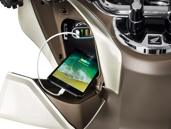 Outra novidade das PCX 150 DLX e Sport 2019 é o Smart Key System de chave presencial, pelo qual basta portar o sensor para que o botão localizado à direita no escudo frontal libere a trava do guidão e ignição, assim como a tecla que opera a abertura do assento e da tampa do bocal de combustível situada no túnel central. Do lado oposto ao botão de trava/ignição está um prático porta-objetos com tampa, dotado da útil tomada 12V em seu interior, que é capaz de abrigar um smartphone e outros objetos.