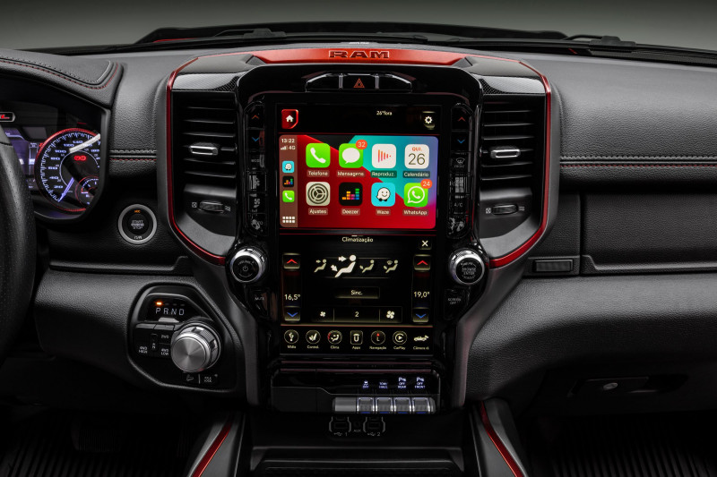 Nenhuma outra picape no mercado (além da Ram 2500) tem uma central multimídia tão capaz como a Uconnect 4C 12 NAV. Colocada verticalmente no painel, a tela é a maior da categoria, com 12 polegadas, podendo ser dividida para mostrar ao mesmo tempo duas das muitas funções disponíveis. Como navegação GPS embutida, câmera 360°, comandos do ar-condicionado digital dualzone, música em execução, entre outras. O sistema é compatível com Android Auto e Apple CarPlay.
