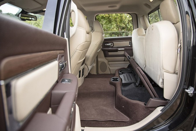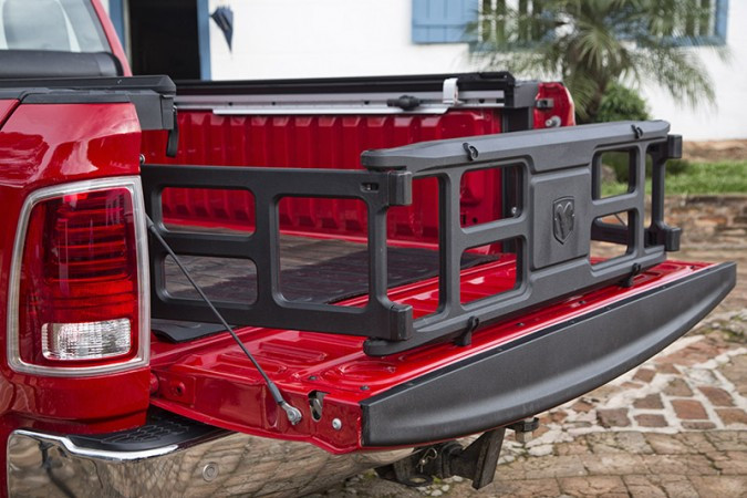 A mesma possibilidade de uso também é oferecida pelas gavetas removíveis embutidas na parte traseira do assoalho interno, sob o tapete. Outro porta-objetos fica sob o assento traseiro, que é bipartido (60/40) e pode ser levantado, mostrando mais um recurso da Ram 2500 Laramie 2016: um sistema de placas dobráveis que nivelam o assoalho atrás dos bancos dianteiros, otimizando o transporte de cargas dentro da cabine. E para transportar cargas que ultrapassem o espaço da caçamba, a picape já vem equipada de série com um extensor de caçamba muito fácil de ser utilizado. A peça também serve como divisor interno.