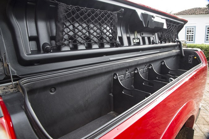 Exclusividade no segmento, a Ram Box está pela primeira vez equipando a Ram 2500 no Brasil. São dois compartimentos localizados nas bordas superiores das laterais da caçamba. Com 132 litros de capacidade cada, esses porta-objetos têm fechadura (que podem ser travadas e destravadas junto com as portas) e dreno, que possibilita o transporte, por exemplo, de carnes frescas ou bebidas envoltas por gelo. Esse sistema também facilita a lavagem.