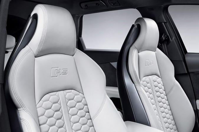 Os assentos esportivos com costura em padrão de colmeia, o volante multifuncional com base plana, a base do câmbio automático e as faixas iluminadas do painel trazem o emblema RS. No Audi virtual cockpit, gráficos específicos da linha RS fornecem informações sobre força G, pressão dos pneus e temperatura, bem como potência e torque.
