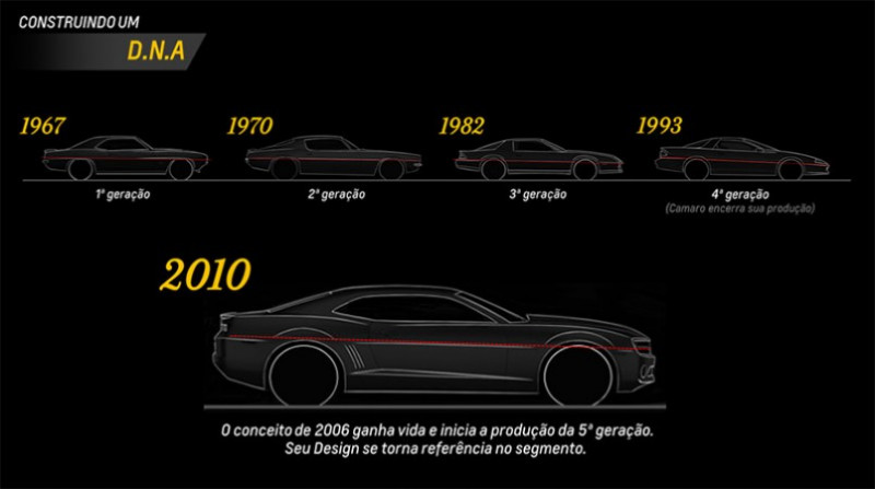Apesar de completamente redesenhado, o Novo Camaro manteve a identidade visual que o consagrou como ícone dos “Muscle Cars”. A sexta geração do carro deixa ainda mais acentuado o efeito dos músculos esculpidos pela carroceria, que teve todas as dimensões revistas e a aerodinâmica aperfeiçoada.