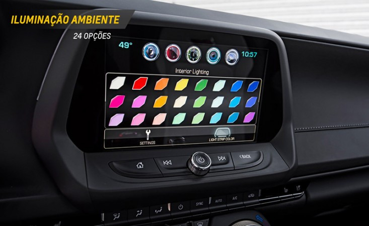 O novo Camaro permite ainda escolher a cor da iluminação dos LEDs internos que contornam o multimídia, os painéis de porta e o porta-copos central. São 24 opções de cores disponíveis, configuráveis na tela do multimedia.