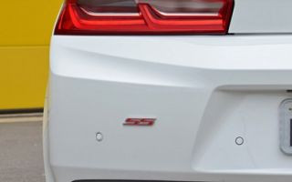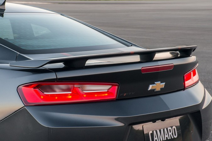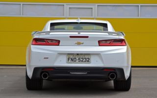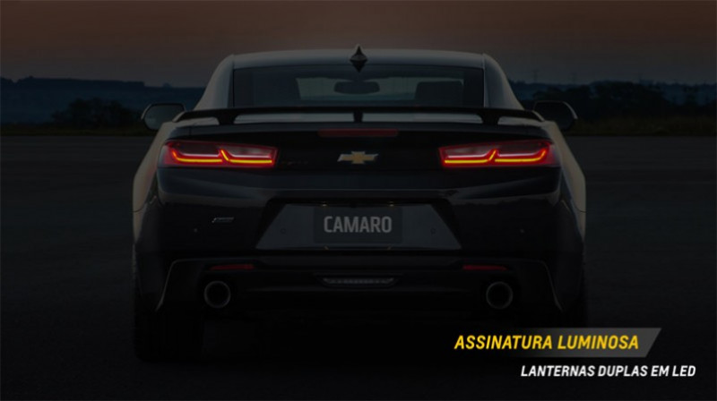 Na parte traseira do Novo Camaro há as tradicionais lanternas horizontais de dois elementos. Assumem aspecto futurista com o efeito dos LEDs. Já o aerofólio exclusivo do modelo SS passa a ser do tipo suspenso, sustentando por três pontos. O novo formato da peça ajudou a elevar em 50% o “downforce” traseiro.