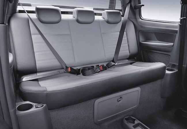 O banco traseiro traz alguns recursos interessantes como o apoia-braço de cada lado. Também existe dois porta-garrafas de até 500 ml(um de cada lado) além de uma saída de 12V adicional. Outro destaque na Saveiro Cabine Dupla é a circulação de ar dentro já que os vidros laterais traseiros são basculantes (outra exclusividade na categoria). Existe também o desembaçador do vidro traseiro (de série em todas as versões da Cabine Dupla).