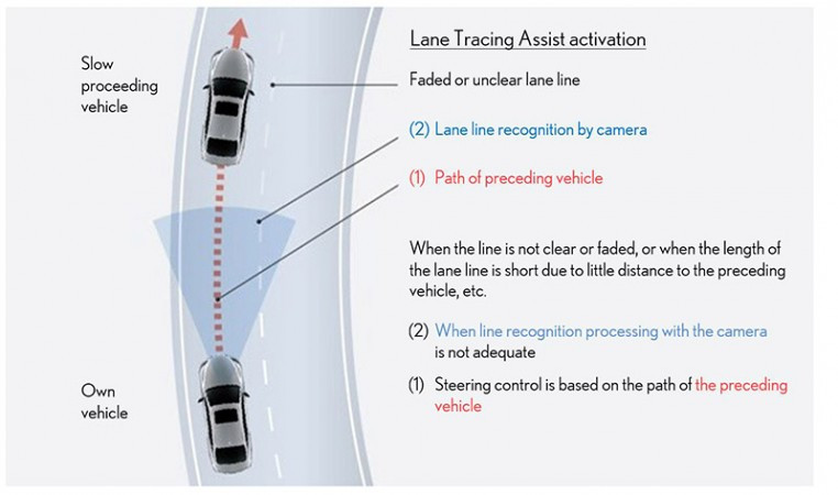 Lane Tracing Assist (LTA): Esse sistema fornece suporte para manutenção de faixa por meio do controle da direção quando o Controle de Cruzeiro Adaptativo estiver ligado. Além da detecção da faixa de rolagem por meio de uma câmera, o rastreamento do caminho à frente possibilita assistência mesmo quando a faixa não pode ser reconhecida, como em um congestionamento quando a distância do carro à frente for muito reduzida.