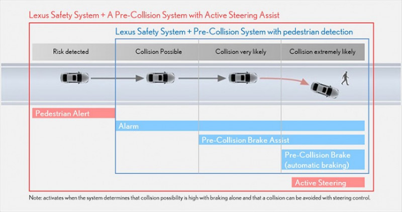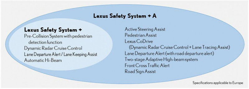 O pacote Lexus Safety System + A inclui Assistência de Direção Ativa que ajuda a prevenir colisões que não podem ser evitadas somente com o acionamento automático dos freios, e o Alerta de Tráfego de Cruzamento Frontal (Front Cross Traffic Alert – FCTA), projetado para alertar o motorista a respeito de possíveis colisões frontais em interseções. Esses recursos, juntamente com o Lexus CoDrive, oferecem um alto nível de suporte em segurança veicular.