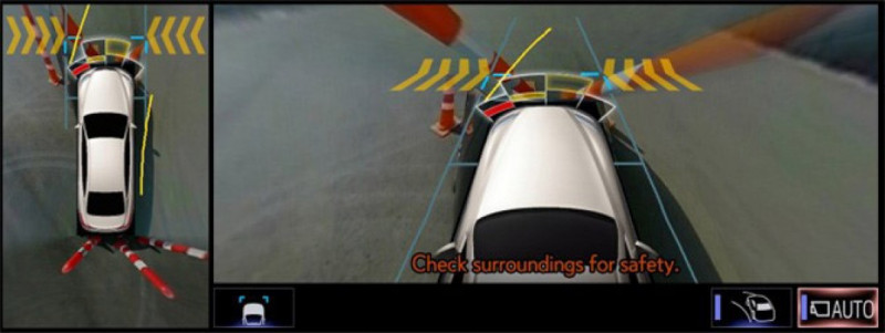 Monitor de visão panorâmica (com vista lateral e funções de visibilidade em curvas): As visualizações laterais e de visibilidade em curvas foram adicionadas ao monitor de visão panorâmica, que suporta verificações de segurança periféricas. A visão lateral produz uma imagem no monitor de 12,3 polegadas do LS, localizado no painel, como se fosse visto a partir de um ponto elevado na parte traseira do carro, permitindo que o motorista confirme mais assertivamente o espaço lateral ao cruzar com outro veículo em uma estrada estreita, por exemplo. Quando a visão lateral está ativa, a função de visibilidade em curvas produz automaticamente uma imagem do veículo vista de trás, em um ângulo em consonância com a operação de condução durante as curvas, contribuindo ainda mais para a segurança dos ocupantes.