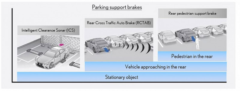 Suporte a frenagens de estacionamento (objetos parados, veículos ou pedestres que se aproximam na parte traseira). Com o objetivo de reduzir os danos causados por acidentes no momento do estacionamento envolvendo outros veículos ou pedestres, além de paredes e outros objetos parados, os sistemas de suporte de frenagem de baixa velocidade foram integrados em um único pacote. Adicionado aos já existentes Intelligent Clearance Sonar (ICS) e Rear Cross Traffic Freight Auto (RCTAB), é o primeiro freio para pedestre traseiro do mundo, que detecta pessoas usando uma câmera traseira e, no caso de uma possível colisão, ajuda a minimizar os danos usando alertas e controle de freio.