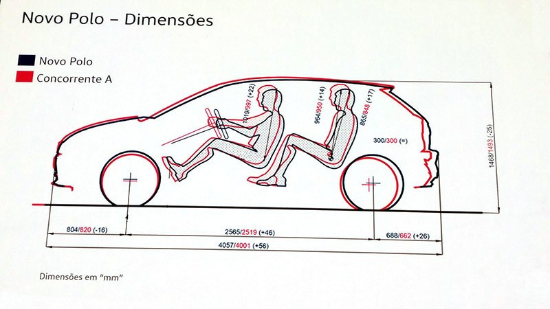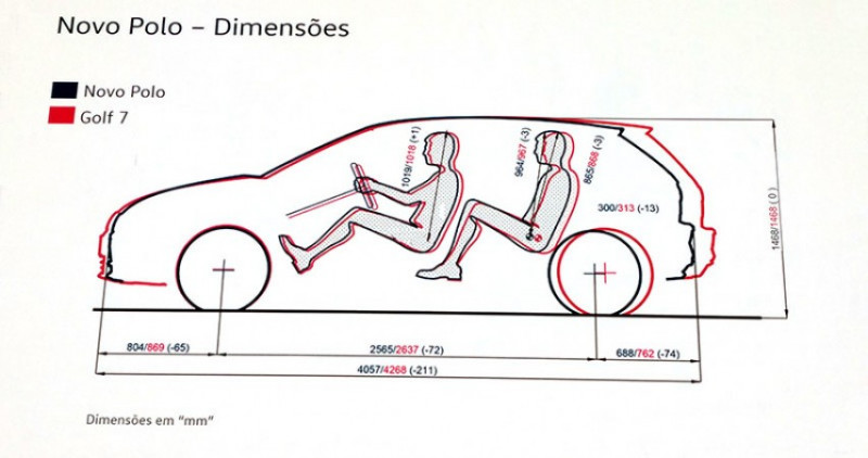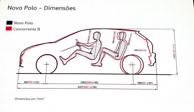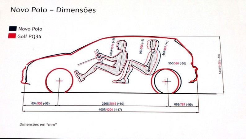 O resultado dessas mudanças, somado ao uso da plataforma MQB, permitiu criar um veículo muito eficiente no aproveitamento do espaço interno. Agora São 4.057 mm de comprimento, com 2.565 mm de entre-eixos, 1.751 mm de largura e 1.468 mm de altura. Com a maior distância entre-eixos foi possível o deslocamento das rodas mais para as extremidades e, consequentemente, encurtar os balanços. Isso permite um perfil mais esportivo. São 804 mm no balanço dianteiro e 688 mm no balanço traseiro.
