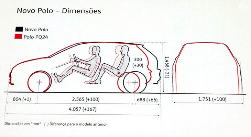 O Novo Polo é um modelo global que chega ao mercado nacional com design dianteiro exclusivo. Suas proporções surpreendem, pois a distância entre-eixos, comprimento externo e largura cresceram em relação a geração anterior do próprio Polo. Apenas a altura continuou praticamente a mesma.