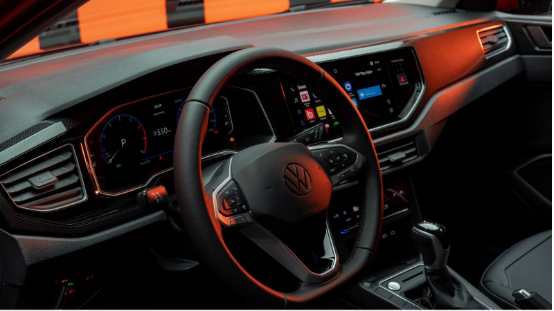 Ainda do lado de dentro, uma das novidades do modelo é o carregamento de celular por indução, que dispensa o uso de fio ou adaptador. As duas saídas USB, do tipo C, trazem comodidade aos passageiros que viajam no banco traseiro. O volante é outro item inédito, com o novo emblema da Volkswagen ao centro. Multifuncional, ele traz aletas para a troca de marchas, recurso ideal para uma direção mais acessível e esportiva. A coluna também tem ajustes de altura e profundidade.