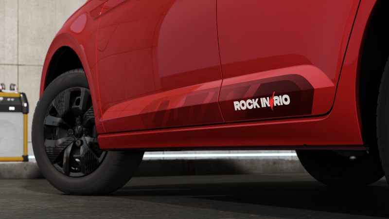 Ainda traseira, o adesivo com nomenclatura Track dá espaço ao nome do festival, assim como o capô dianteiro, que recebe o logo aplicado do lado do direito. Nas laterais, adesivo com design exclusivo do Rock in Rio percorre a parte inferior das portas dianteiras e traseiras.