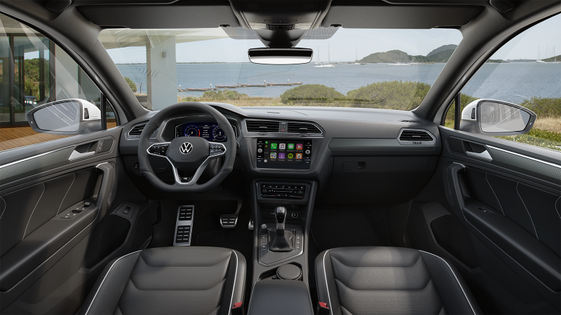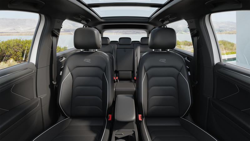 Os bancos em couro são perfurados, climatizados, elétricos e com memória para o motorista. E ainda recebem o emblema “R” no encosto. O novo volante capacitivo com botões touch, aquecimento e shift paddles tem alusão à versão R-Line na parte inferior. O acabamento em couro se estende para o painel e também para as quatro portas com porta-objetos revestidos de carpete, completando os materiais premium do habitáculo.