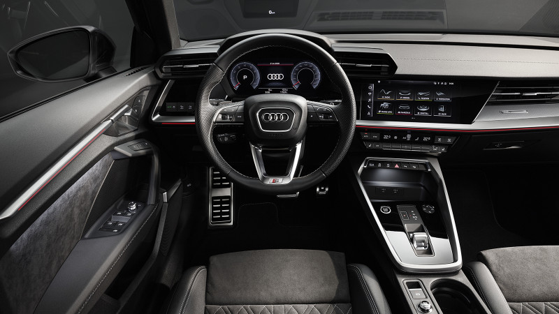O cockpit dos novos A3 tem foco total no motorista. Os bancos dianteiros superesportivos com apoio de cabeça integrados ao assento, acabamentos de alumínio, maçanetas de portas marcantes e um painel de instrumentos com aparência black-piano são alguns dos destaques. Ele usa elementos familiares dos modelos de classes mais altas da marca, e está equipado de série com um display sensível ao toque de 10,1 polegadas – integrado no centro do painel de instrumentos, ele reconhece letras inseridas à mão, fornece feedback acústico.