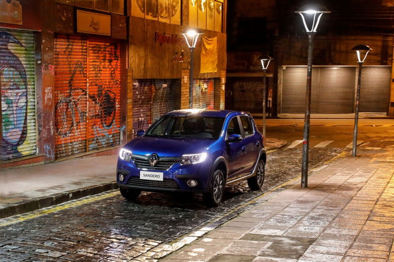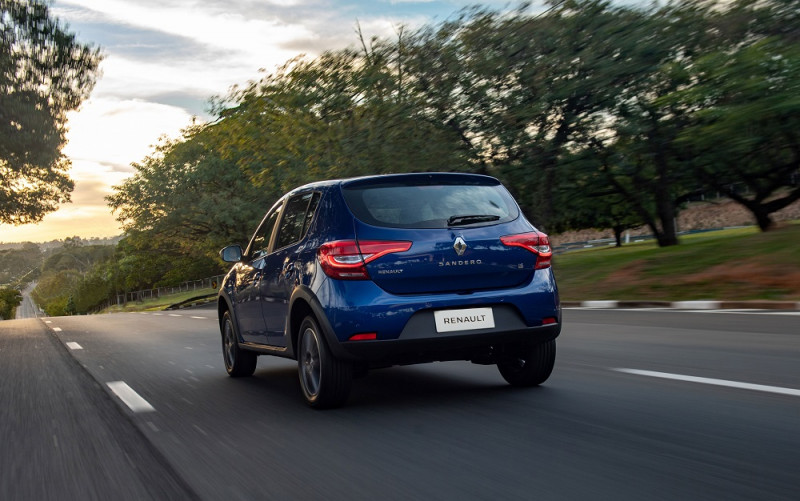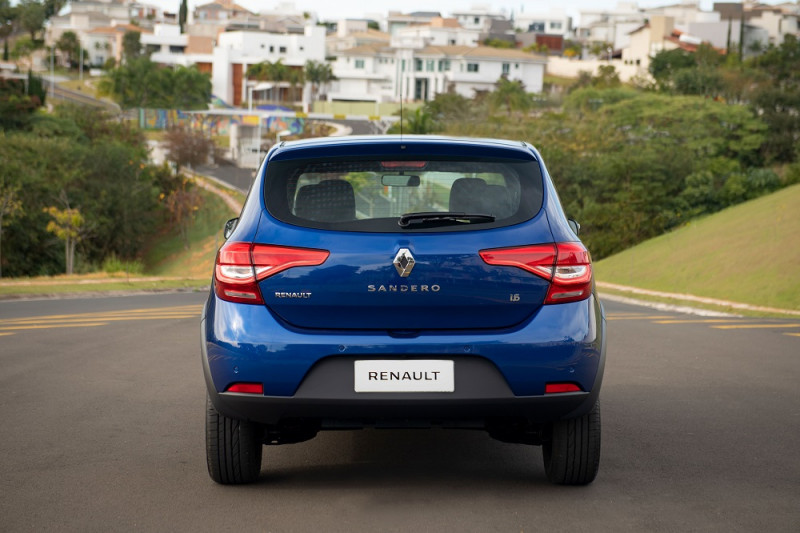 O Sandero tem o maior comprimento (4.070 mm), o maior entre-eixos (2.590 mm) e o maior porta-malas da categoria (320 litros). O modelo é oferecido nas versões: Life (com motor 1.0 SCe e câmbio manual), Zen (com motor 1.0 SCe ou 1.6 SCe e câmbio manual ou CVT X-Tronic), Intense (com motor 1.6 SCe e câmbio CVT X-Tronic) e R.S. 2.0 (com motor 2.0 e câmbio manual de seis marchas).