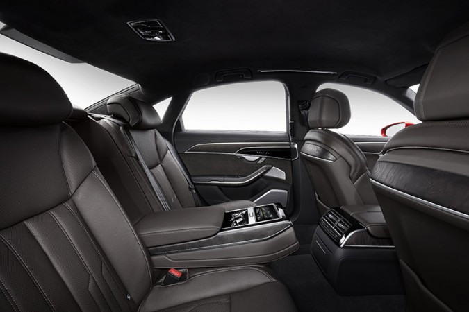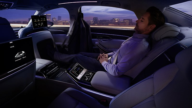 O toque de maior classe do novo modelo está na parte traseira direita com o assento para relaxamento opcional no A8 L. Ele vem com quatro opções de ajuste diferentes e um apoio para os pés. Nesse assento, o passageiro poderá se aquecer e massagear as solas dos pés. Os novos e confortáveis apoios de cabeça completam a experiência. Os passageiros do banco de trás também poderão controlar uma ampla variedade de funções, como iluminação ambiente, as novas luzes de leitura HD Matrix, além de fazer telefonemas por meio de uma unidade operacional separada. O controle remoto do assento traseiro, com sua tela OLED do tamanho de um smartphone, é removível e fica localizado no apoio de braço central.