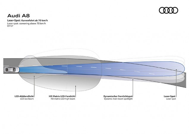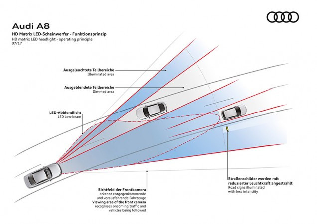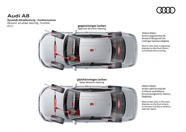 O Audi A8 também é o primeiro automóvel com condução autônoma nível 3, que será produzido em série. A partir de 2018, a Audi incluirá gradualmente na produção funções de condução pilotada como assistente de estacionamento (“parking pilot”), assistente de garagem (“garage pilot”) e assistente de trânsito (“traffic jam pilot”).