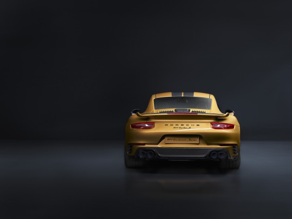 O que torna o 911 Turbo S Exclusive Series tão diferenciado é a pintura em Amarelo Dourado Metálico e os vários componentes em carbono, como elementos decorativos do capô, teto e saias laterais. As duas faixas em tecido de carbono que contornam o teto e o capô reforçam o visual esportivo do carro. A traseira se caracteriza pela asa posterior do Turbo Aerokit, a nova saia traseira, a entrada de ar lateral em carbono e o sistema de escapamento com duas saídas duplas pretas feitas de aço inoxidável. Os para-lamas são decorados com plaquetas da Porsche Exclusive Manufaktur. Além da cor Amarelo Dourado Metálico, o veículo também é oferecido em outras cores externas cuidadosamente selecionadas.
