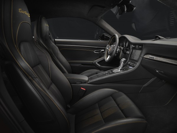 Os bancos esportivos com 18 regulagens são revestidos com duas camadas de couro perfurado. A camada interna tem duas faixas em Amarelo Dourado, garantindo um efeito exclusivo. As junções e o letreiro Turbo bordado nos apoios de cabeça também são em Amarelo Dourado contrastante, enquanto o forro do teto é feito de Alcântara. Uma fina faixa de cobre é integrada aos frisos do pacote interno de carbono. A placa mostrando o número da edição limitada no lado do passageiro reforça a exclusividade do carro. As proteções na entrada das portas, também com acabamento em carbono, trazem a identificação Exclusive Series iluminada.
